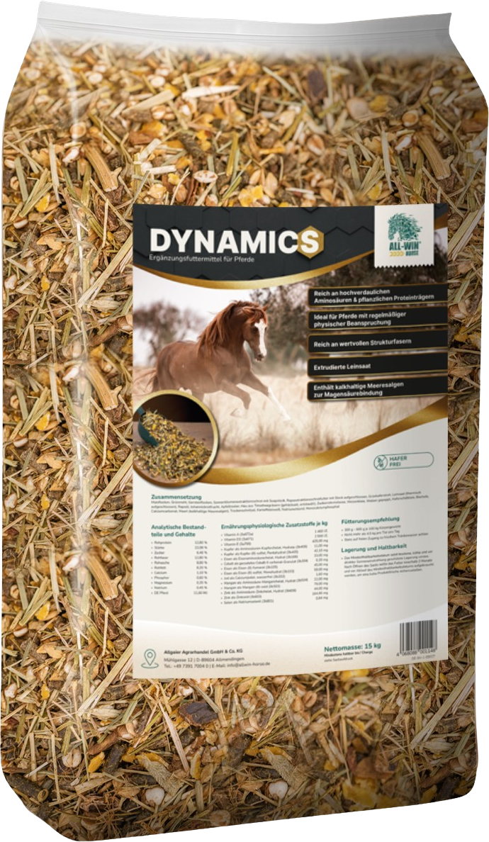 ALL-WIN Horse Dynamics ist ein haferfreies, Struktur- und Nährstofffutter für Pferde mit regelmäßiger Beanspruchung im Training und Sport. Die Rezeptur kombiniert hochwertige Proteinquellen, wertvolle Strukturfasern und aufgeschlossene Saaten zu einem modernen Futterkonzept, das auf Leistung, Akzeptanz und eine flexible Fütterung ausgelegt ist. Durch die Vielfalt pflanzlicher Komponenten entsteht ein schmackhaftes, nachhaltig einsetzbares Kraftfutter, das sich ideal in den täglichen Fütterungsplan integrieren lässt.