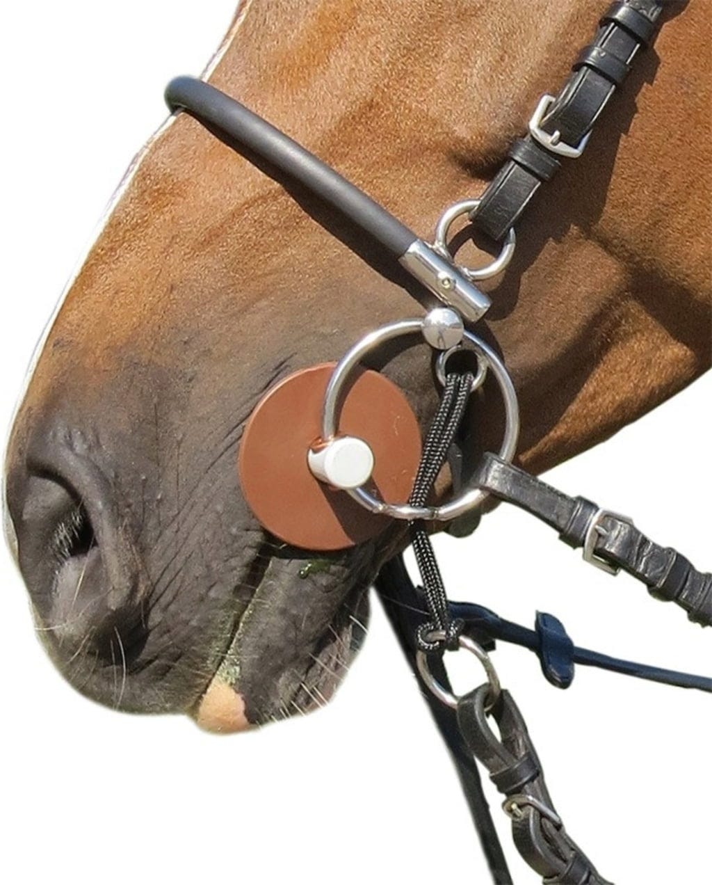 Hier handelt es sich um eine absolute Innovation, die für eine gleichmäßige Verteilung des Zügeldrucks sorgt. Während der erste Zügel bei Annahme Druck auf Nase sowie Unterkieferäste ausübt, fungiert der zweite Zügel als Kinnkette, die wenn nötig losgelassen werden kann.