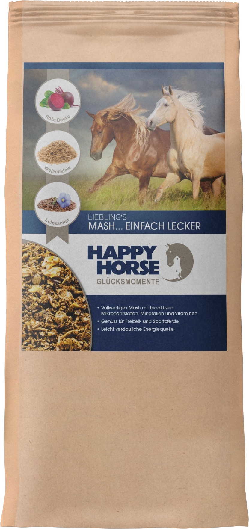 Du suchst nach einer besonders schmackhaften Ergänzung zur täglichen Futterration deines Pferdes? Happy Horse Lieblings Mash vereint hochwertige Fasern, kaltgepresste Öle und natürliche Zutaten zu einer bekömmlichen Mash-Mahlzeit - ideal als Belohnung oder als regelmäßiger Futterzusatz.