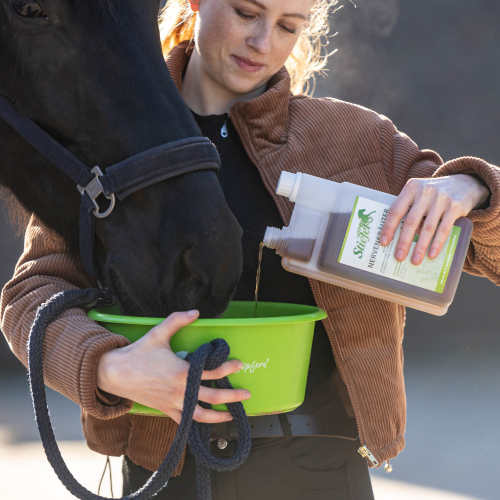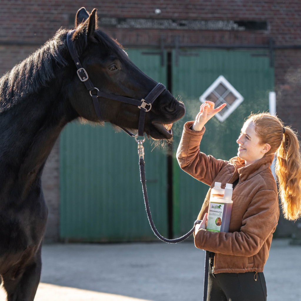 Stiefel Nervenkräutersaft ist ein Kräutersaft aus einer natürlichen Kräutermischung ohne künstliche Aromastoffe zur Fütterung in Belastungssituationen, bei Nervosität oder Gereiztheit. Die Kräuter können sich positiv auf das Nervenkostüm des Pferdes auswirken und so in aufregenden Situationen für mehr Ruhe und Gelassenheit sorgen.