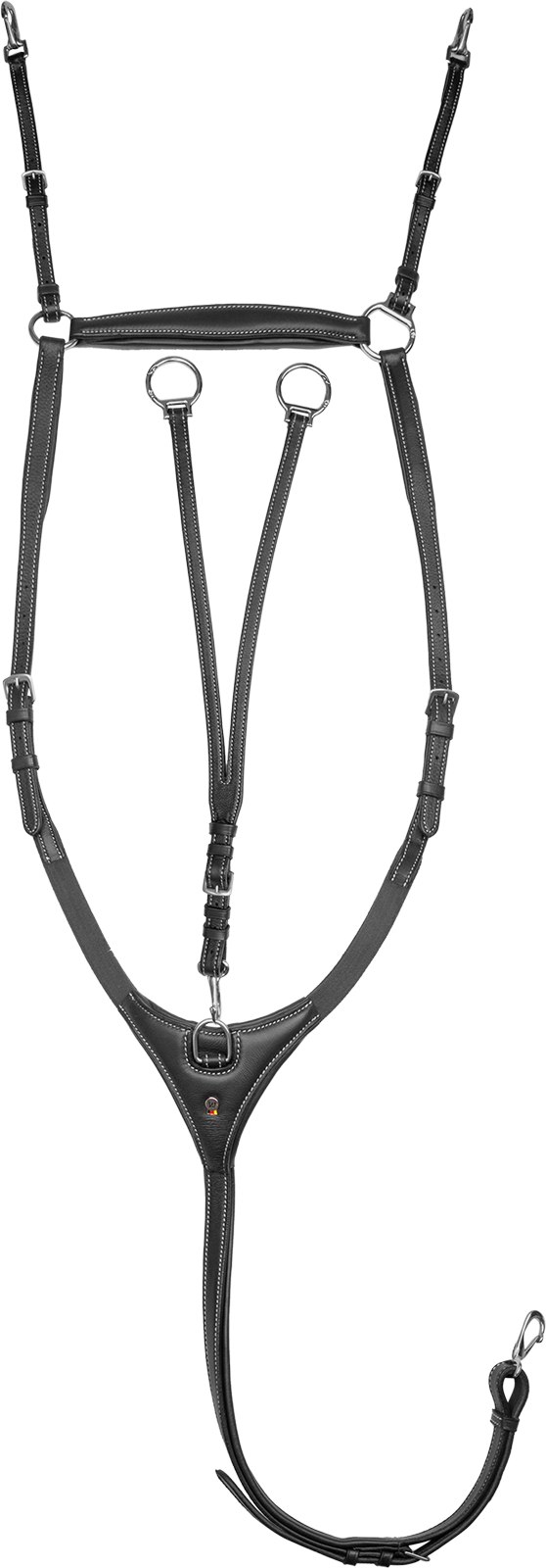 Besonders durchdacht sind die Befestigungsmechanismen: Über robuste Karabiner lässt sich das Vorderzeug schnell am Sattel und Sattelgurt fixieren. Ein spezieller Snap-Ring am Widerrist ermöglicht es dir zudem, das Vorderzeug anzulegen, ohne das Pferd abbinden zu müssen – ein echter Sicherheitsvorteil im Stallalltag. Die abnehmbare, größenverstellbare Martingalgabel ist mit praktischen Snap-Ringen ausgestattet, mit denen du die Zügel in Sekundenschnelle ein- und ausklicken kannst, ohne sie mühsam einschnallen zu müssen.