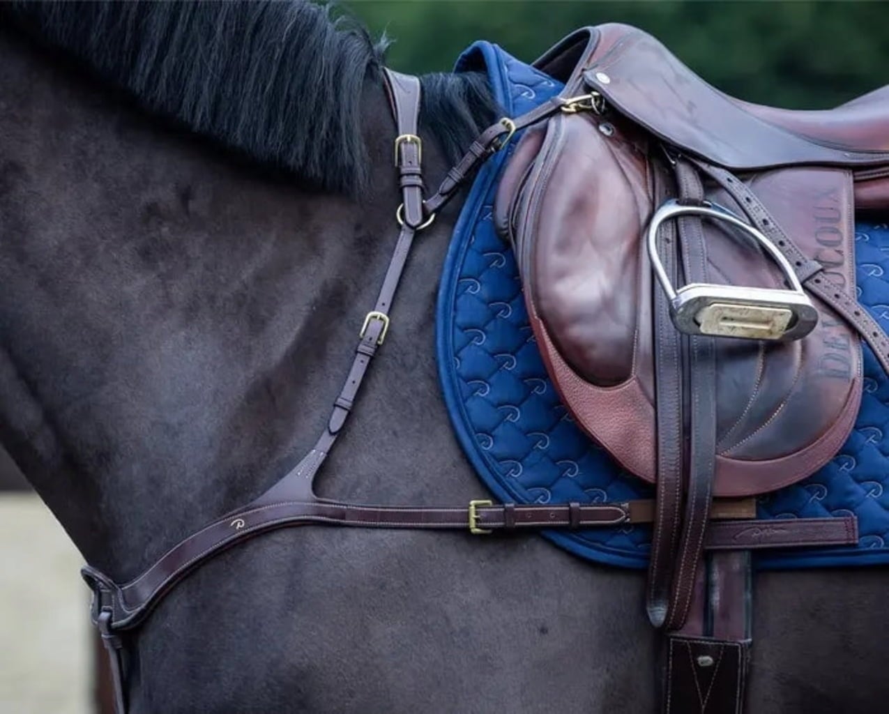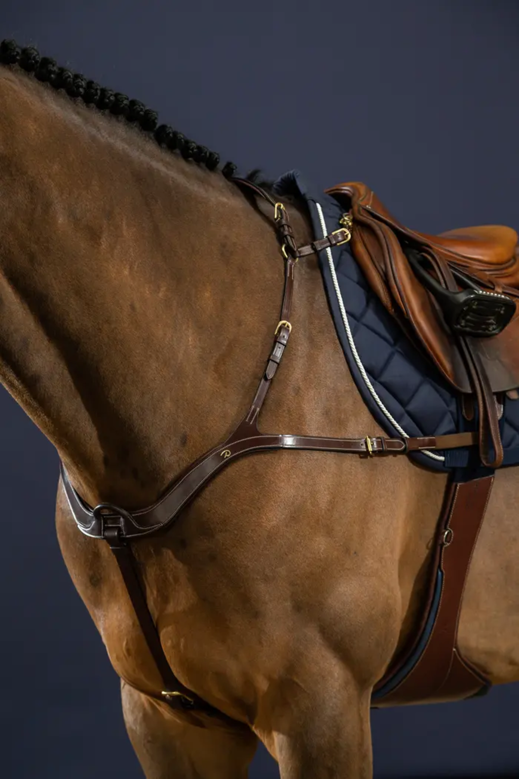 Ce bridon de poitrail en cuir fin séduit par sa coupe anatomique spécifique ainsi que par la qualité remarquable de son matériau et de sa fabrication. L’association du design et du cuir, l’intégration d’inserts élastiques de 6 cm et de cinq points d’attache assurent une liberté de mouvement optimale des épaules. De plus, le bridon de poitrail dispose d’un pont réglable pour un ajustement encore plus précis. La fixation à la selle s’effectue facilement grâce à un mousqueton.