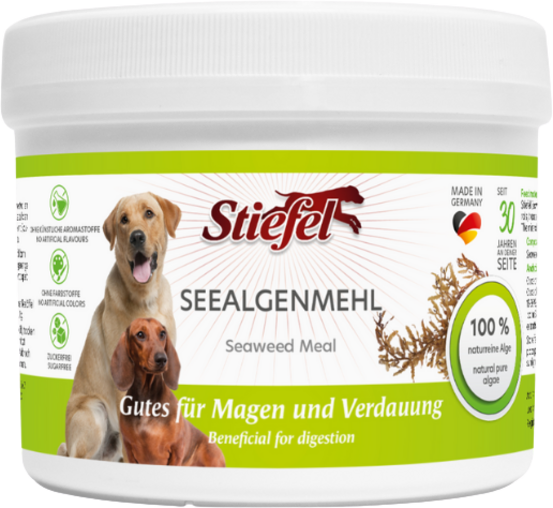 La farine d'algues Stiefel est composée à 100 % d'algues naturelles. Celle-ci font partie des algues brunes et sont riches en précieux minéraux, oligo-éléments et acides aminés. Grâce à sa composition précieuse, la farine d'algues Stiefel peut avoir un effet positif sur la peau et le pelage du chien. De pluse elle peut renforcer le système immunitaire et les défenses naturelles de l'organisme. Les ingrédients organiques sont absorbés de manière optimale sans que le corps n'aie à les transformer.