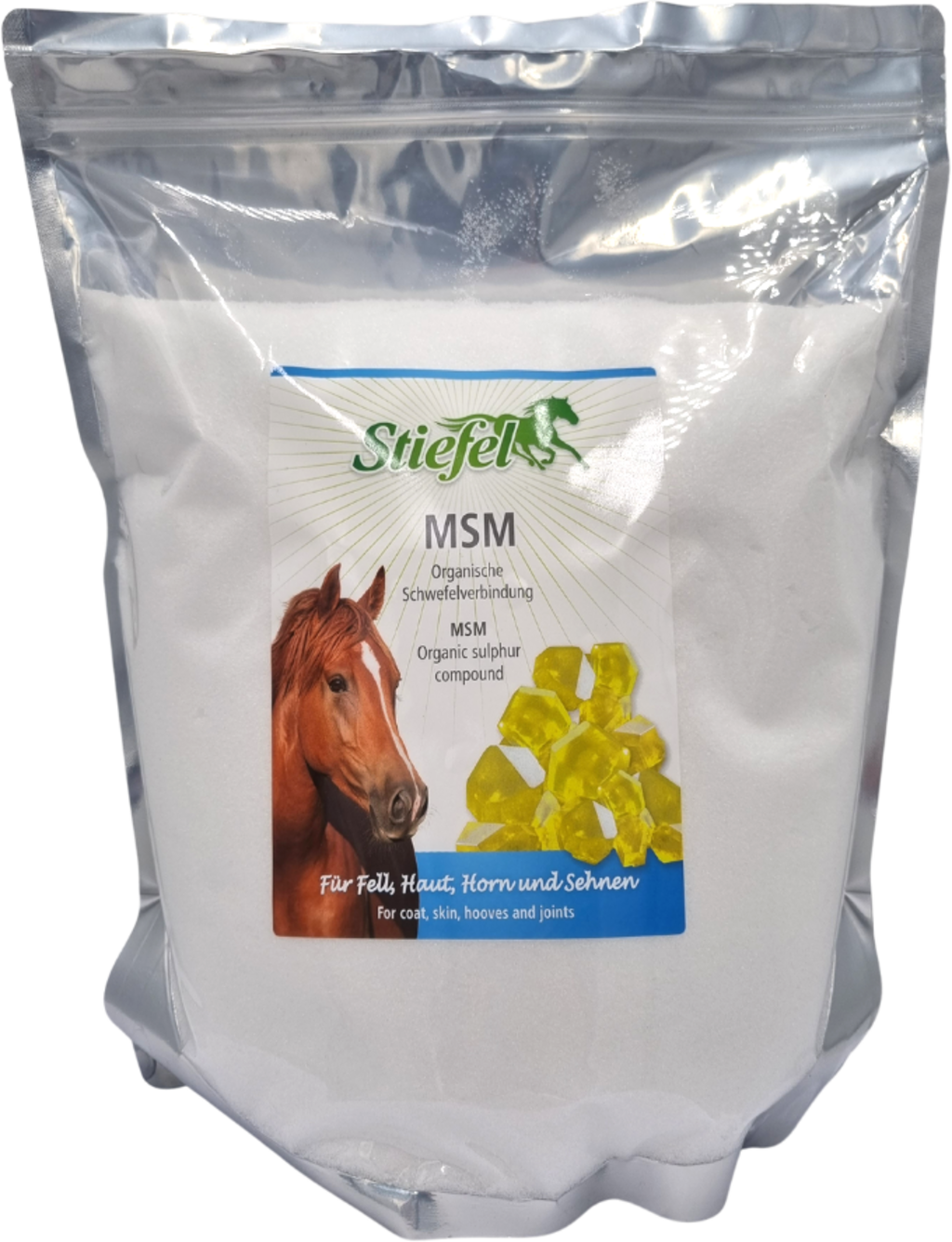 Le MSM est un composé organique soufré (méthylsulfonylméthane) qui peut avoir un effet positif sur les articulations. De plus, il peut contribuer à avoir un pelage sain et la croissance des sabots et contribuer à la formation naturelle du tissu conjonctif.