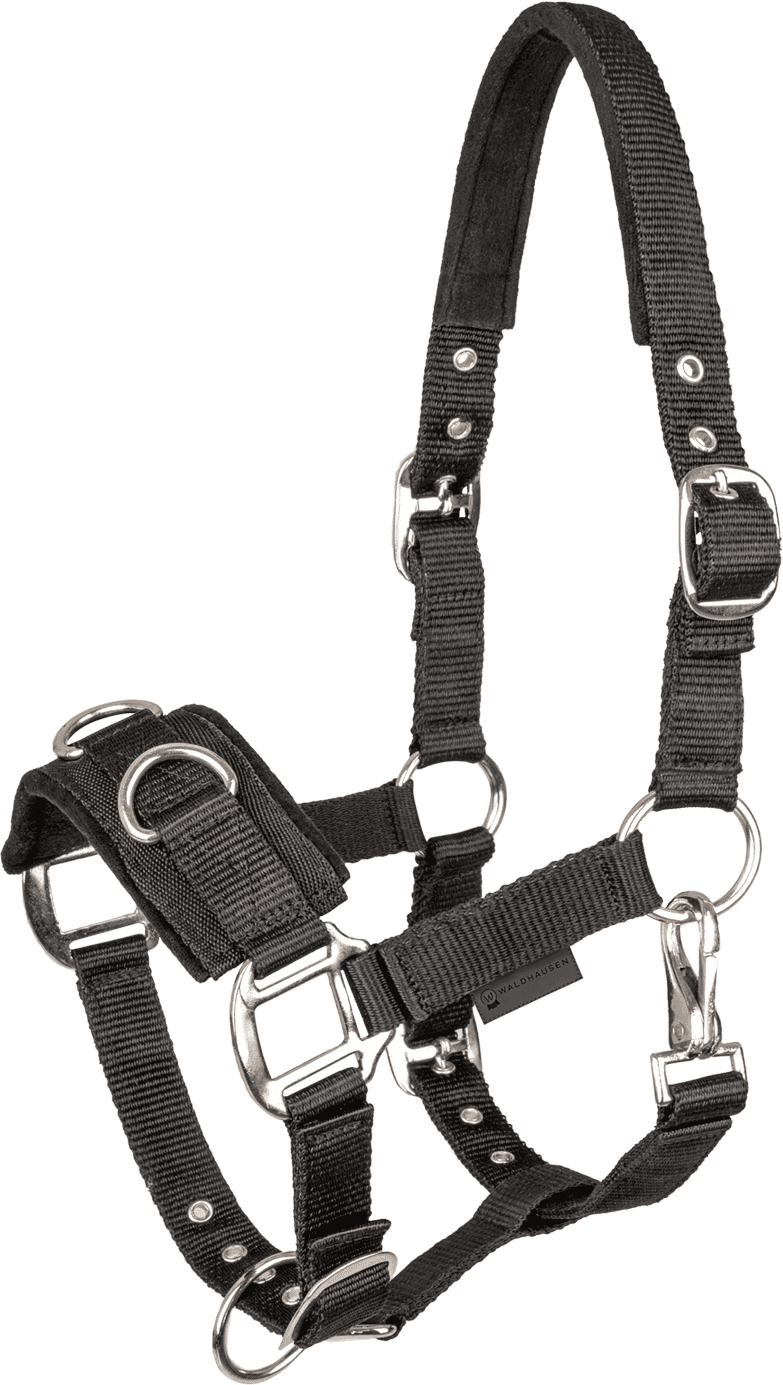 Un ajustement correct est essentiel : la muserolle doit être positionnée comme celle d’une bride anglaise. Les anneaux solides situés sur le chanfrein offrent plusieurs possibilités d’attache pour la longe ou pour les enrênements nécessaires.