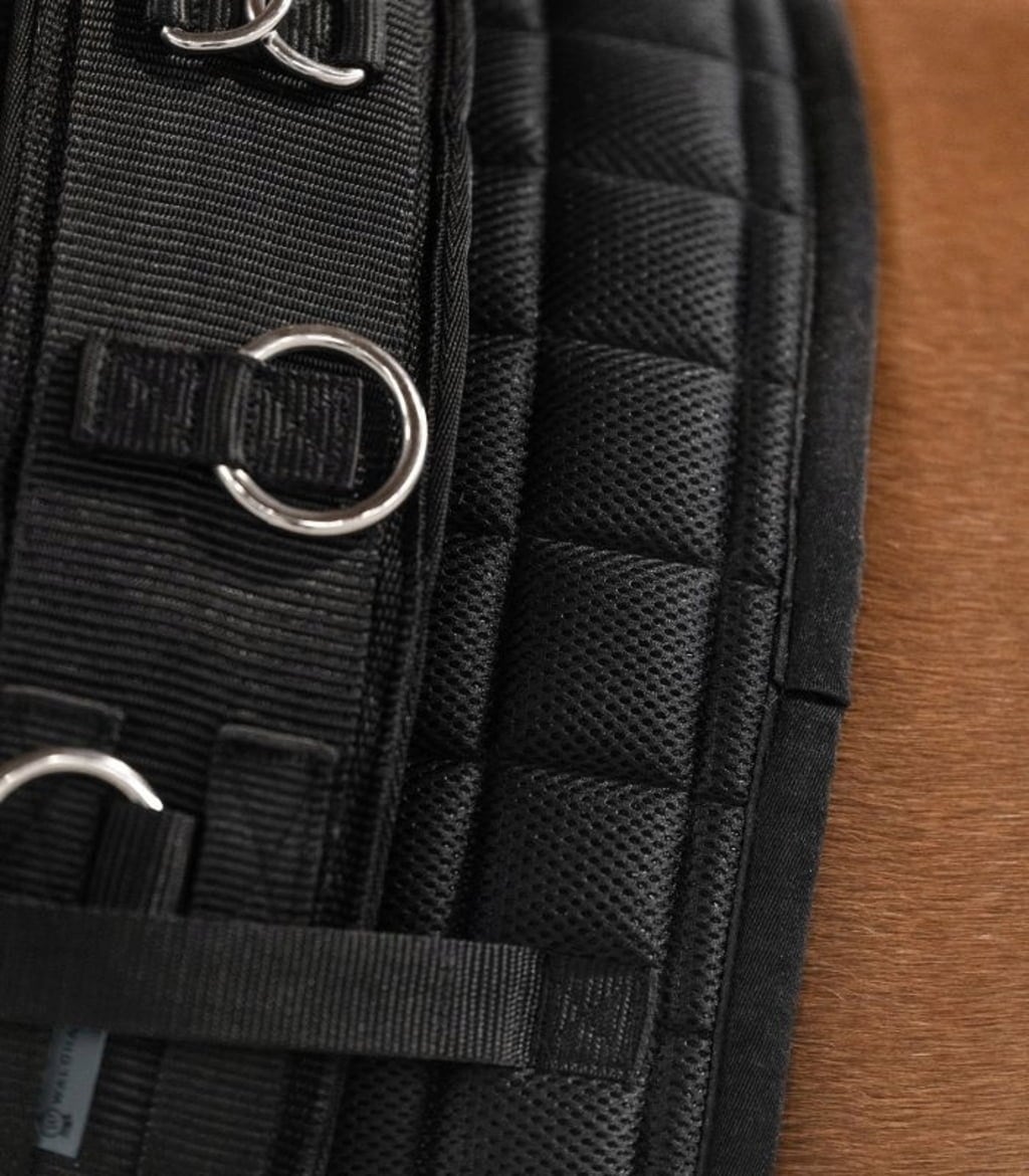 Un atout pour les amateurs d’élégance : les boucleries sont en argent brillant, conférant au surfaix une allure raffinée. Sur le plan fonctionnel, il séduit par ses 12 anneaux disposés de manière stratégique, offrant une grande flexibilité pour la fixation des longes et enrênements selon les besoins individuels.