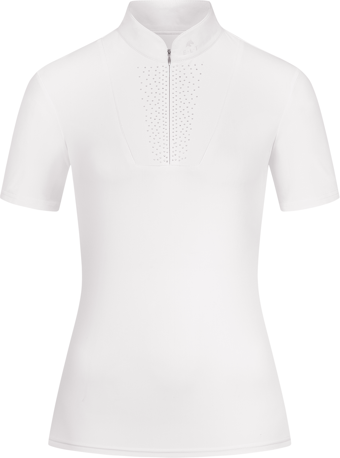 Een bijzonder blikvanger is het inzetstuk aan de voorkant, subtiel versierd met decoratieve strass-steentjes, die onder je jasje fonkelende accenten geven. De elegante opstaande kraag sluit comfortabel met een onzichtbare ritssluiting, terwijl de glinsterende E·L·T-logo print op kraag en achterkant het exclusieve design benadrukt. Zo combineer je professionele performance met een vleugje glamour.