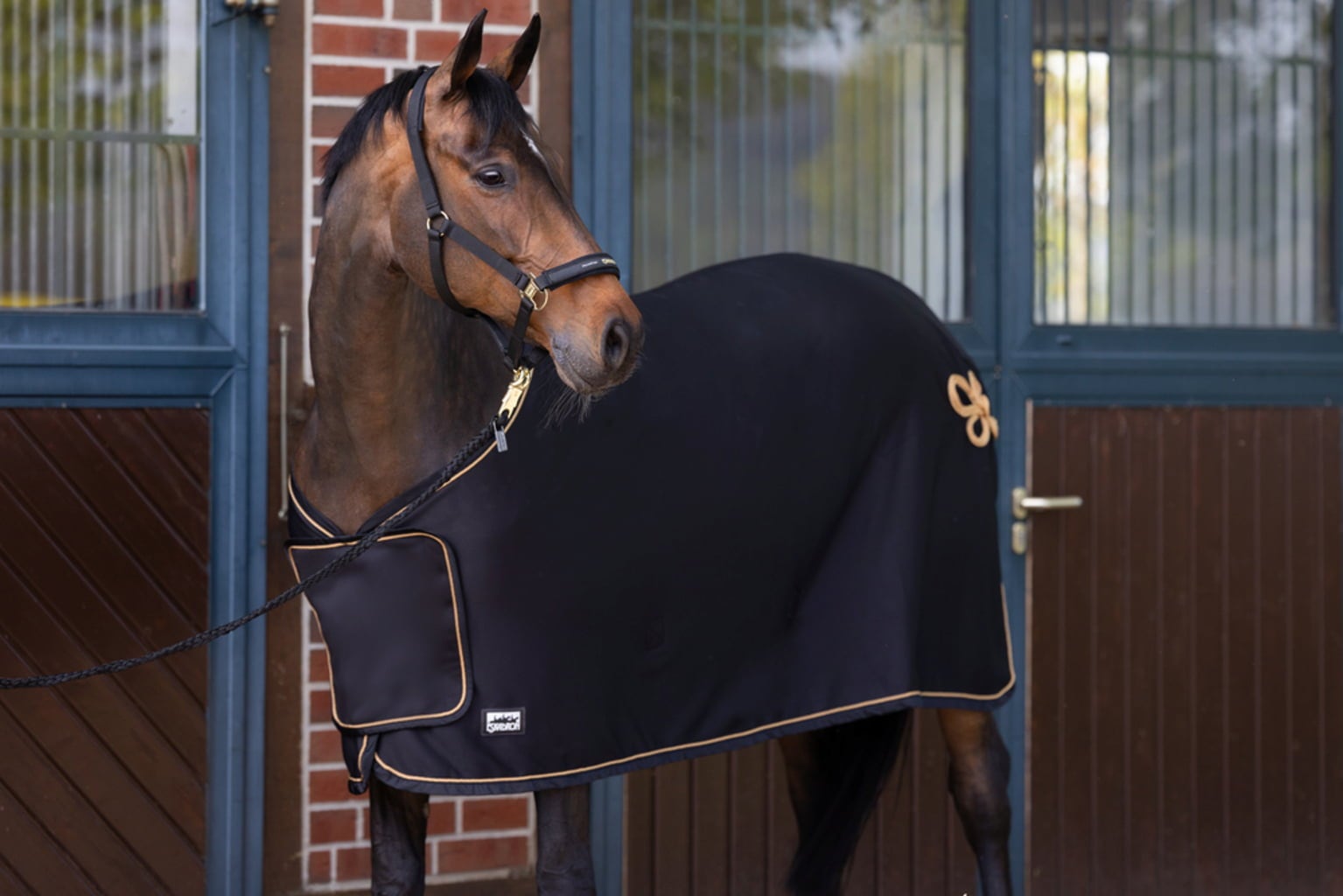 Het ademende materiaal zorgt voor een aangenaam klimaat en ondersteunt een optimale vochtafvoer. Dankzij de chique showdeken-snit met borstflap en de verfijnde details zoals de glanzende bies en sierlijke staartkoord, is je paard niet alleen functioneel maar ook bijzonder elegant aangekleed.