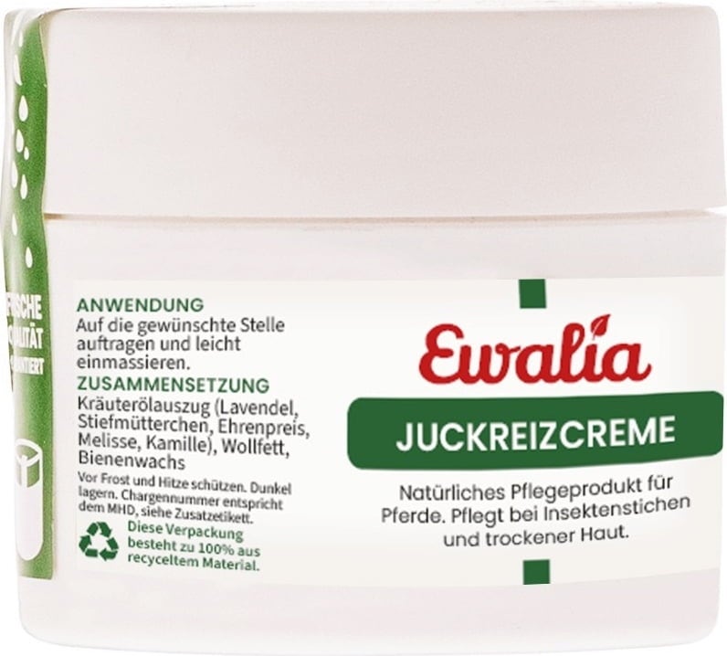 EWALIA Jeuk Crème verzorgt je paard bij insectenbeten en droge huid. De crème bevat waardevolle kruidenoliën om de huid te verzorgen en te regenereren. Ook ideaal als doelgericht muggen- en insectenwerend middel.