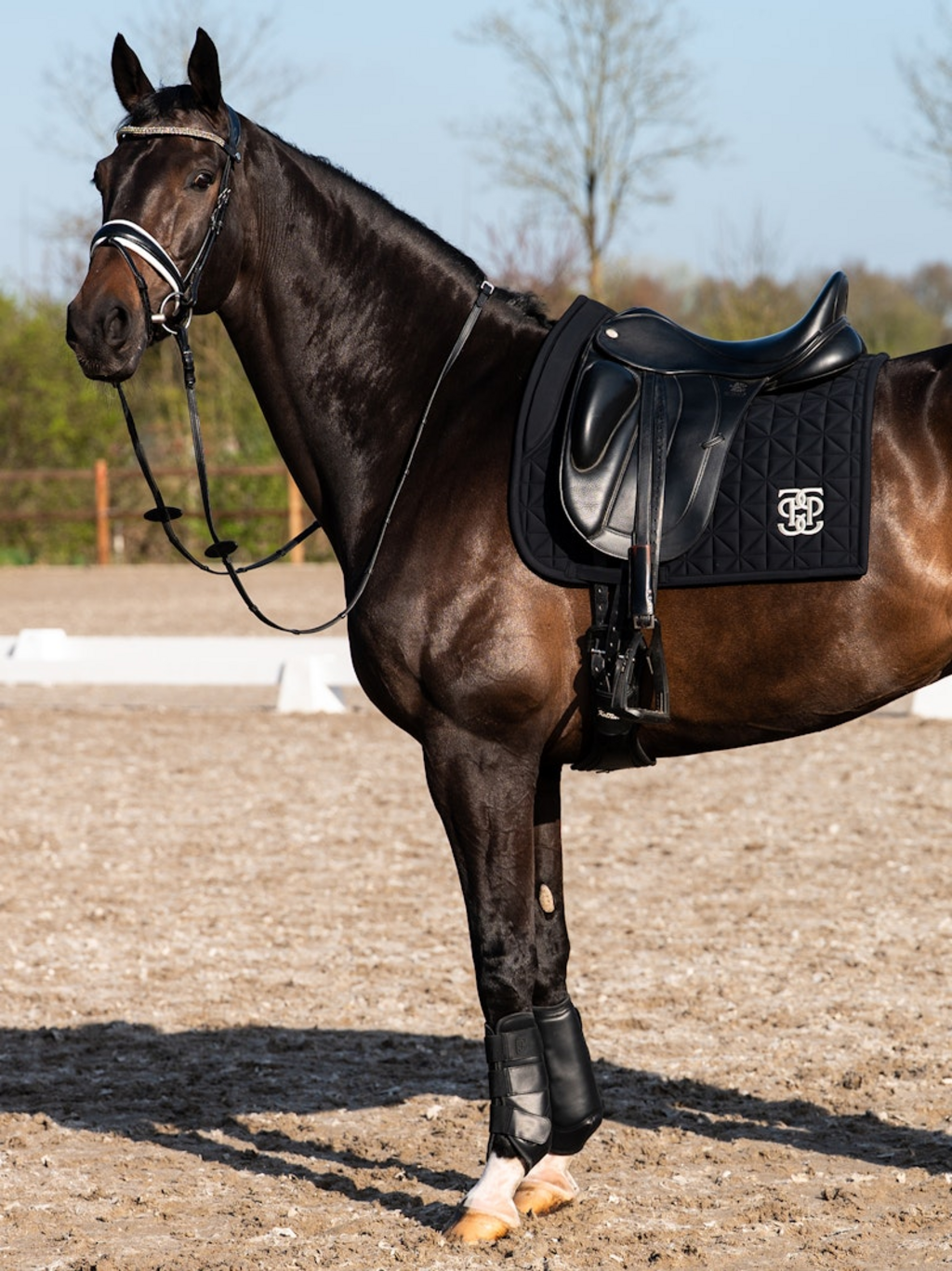 Het diamantvormige quiltpatroon en het contrasterende PS-monogram geven het zadeldek een elegante afwerking, terwijl een gepersonaliseerd citaat langs de wervelkolom zorgt voor de kenmerkende PS-touch. Ideaal voor dagelijks gebruik en voor wedstrijden.