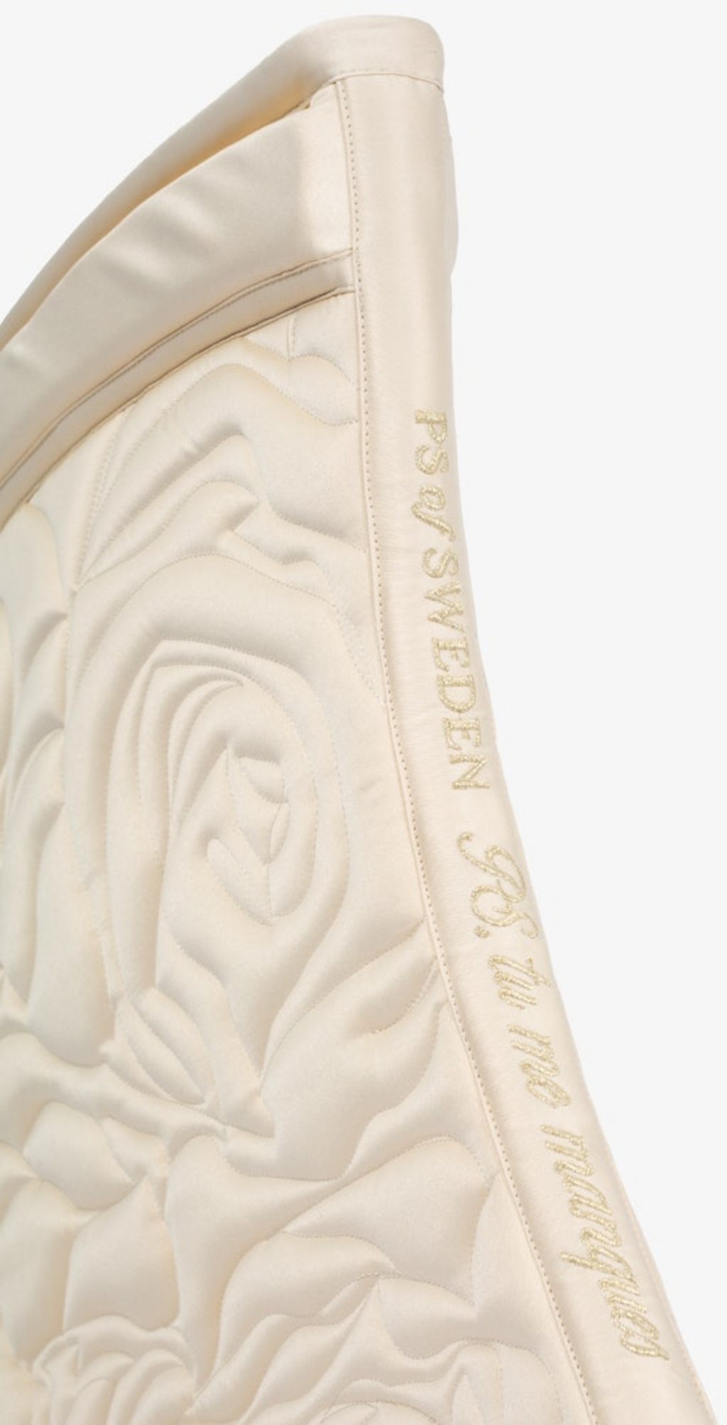 De antislipvulling zorgt voor een veilige ligging onder het zadel, terwijl de sneldrogende voering vocht betrouwbaar afvoert. Het satijnen bovenmateriaal geeft het zadeldek een elegante, glanzende uitstraling. Een gepersonaliseerd citaat langs de wervelkolom maakt het exclusieve design helemaal af.