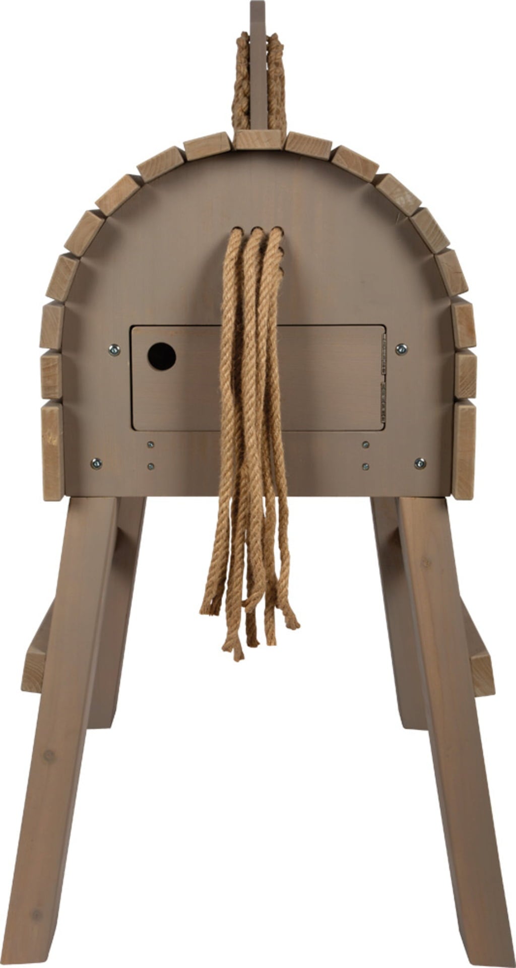 Dit grote houten paard maakt indruk met zijn stabiele constructie en wijd uitstaande poten, die zorgen voor een veilige stand. Een praktische opstap vergemakkelijkt het beklimmen en traint spelenderwijs motoriek en balans. De manen en staart van sisal nodigen uit tot creatief kammen en vlechten. Achter het klepdeurtje aan de achterkant bevindt zich een royale opbergruimte voor halsters, borstels en accessoires. De rug is zo ontworpen dat echte zadels en zitkussens er perfect op passen. Dankzij de weerbestendige grijze verf staat het paard zowel binnen in de kinderkamer als buiten in de tuin prachtig.