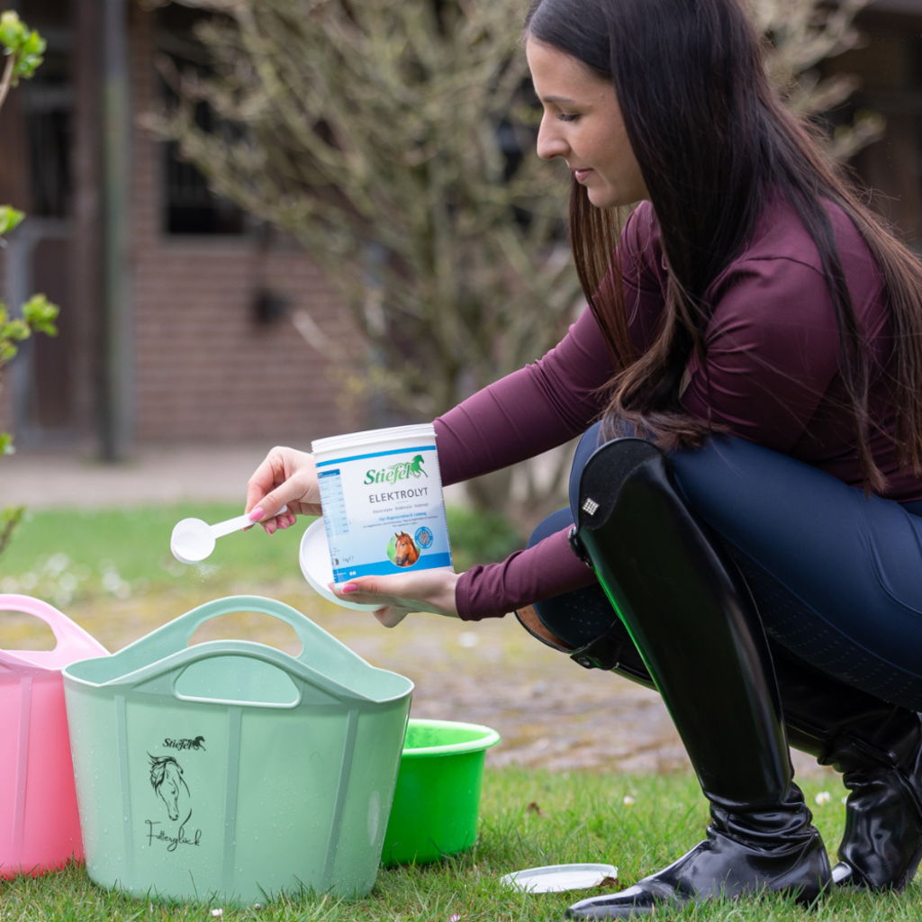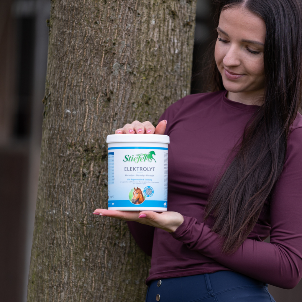 Stiefel Electrolyte wordt gebruikt om elektrolytenverliezen bij sportpaarden te compenseren en om de water- en elektrolytenbalans bij veulens en oude paarden te stabiliseren. Het bevat natrium, kalium, calcium en magnesium. Elektrolyten zoals natrium en kalium zijn nodig om de druk in de lichaamscellen te stabiliseren. Grote hoeveelheden elektrolyten worden uitgescheiden tijdens sterk zweten bij hoge temperaturen en als gevolg van hoge prestaties of diarree. Het verlies van elektrolyten is evenredig met het verlies aan zweet. Op warme dagen kan een paard met een gewicht van ca. 600 kg kan in 5-7 uur tot 35 l zweet verliezen. Elektrolyten zijn verantwoordelijk voor het reguleren van de waterhuishouding. Een onvoldoende waterbalans leidt tot een gebrek aan energie en prestatieverlies. De sterk geconcentreerde ingrediënten van Stiefel Electrolyte compenseren dit tekort en dragen bij aan een snellere regeneratie. Stiefel Electrolyte is ook verrijkt met magnesium om de spierstofwisseling te ondersteunen. Elk paard dat moet presteren, moet tijdens het toernooiseizoen en tijdens intensieve training voldoende worden voorzien van elektrolyten. Oude paarden kunnen ook hoge elektrolytenverliezen ervaren bij hoge temperaturen. Er zijn helaas geen afzettingen voor elektrolyten in het lichaam. Bij hoge consumptie is daarom voldoende aanvoer in het voer nodig.