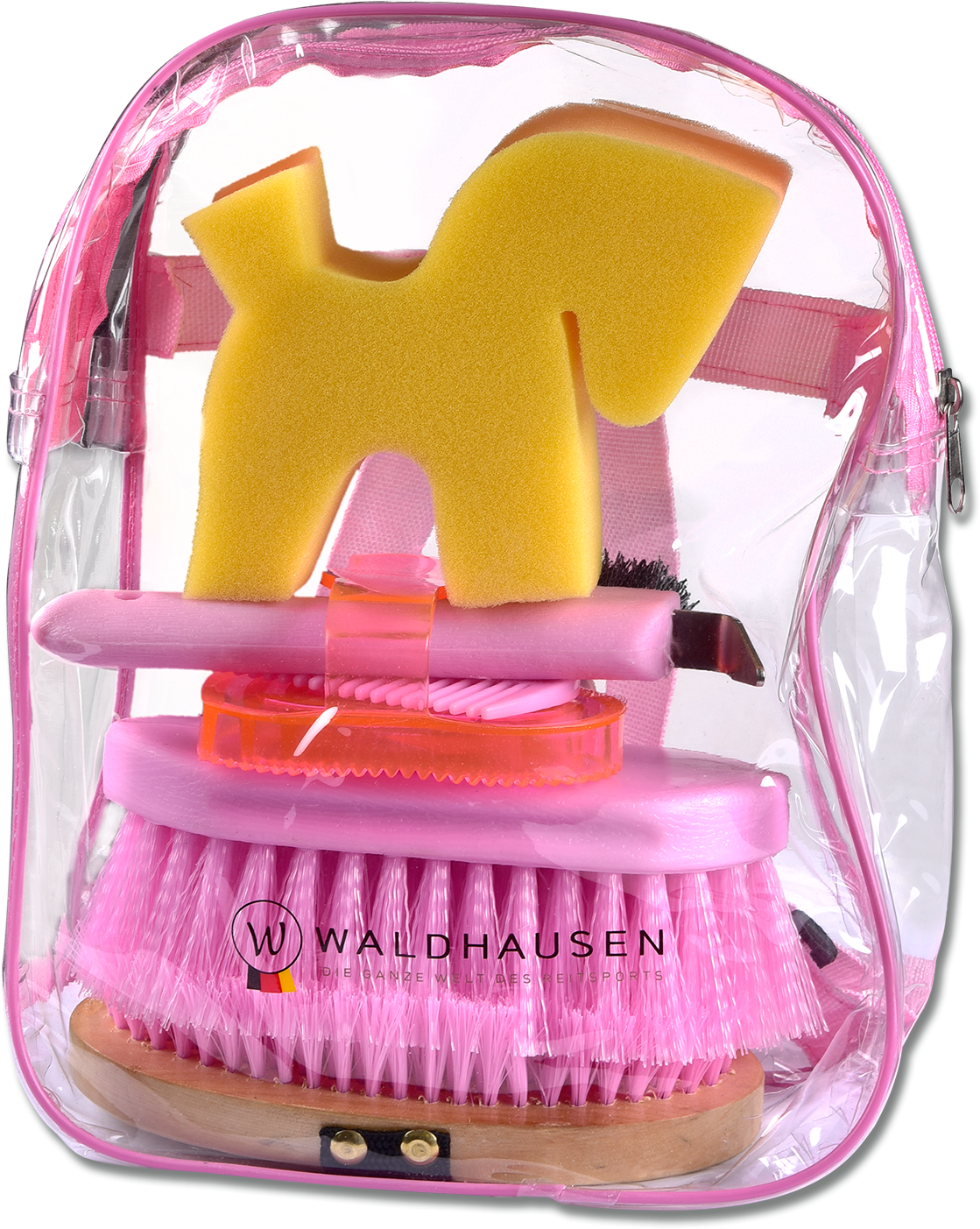 Ben je op zoek naar de perfecte set die alles bevat wat je nodig hebt voor de dagelijkse verzorging van je paard? De Waldhausen Grooming Kit is de ideale basisuitrusting voor paardenfans jong en oud, en wordt geleverd in een superpraktische, transparante rugzak.