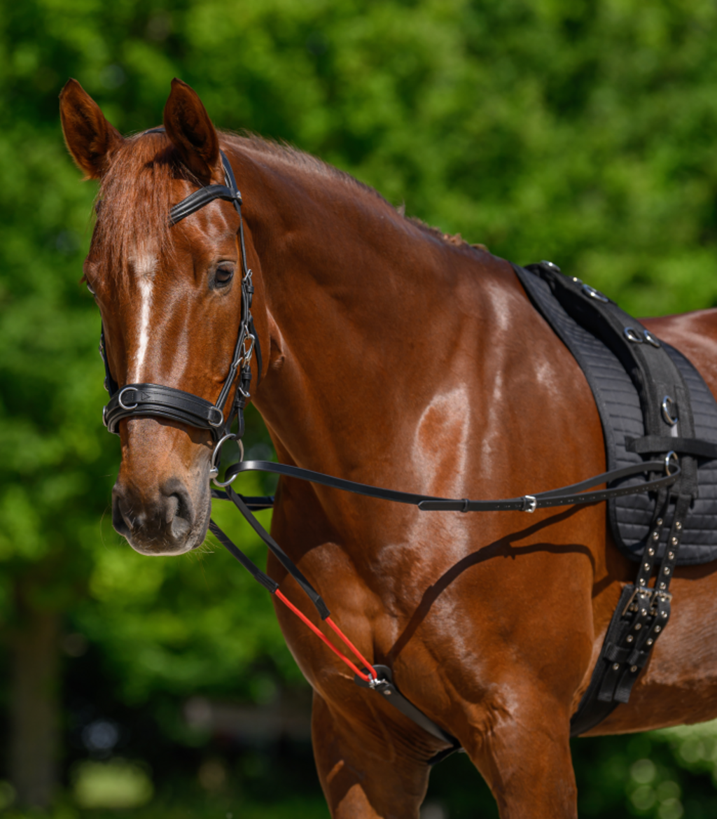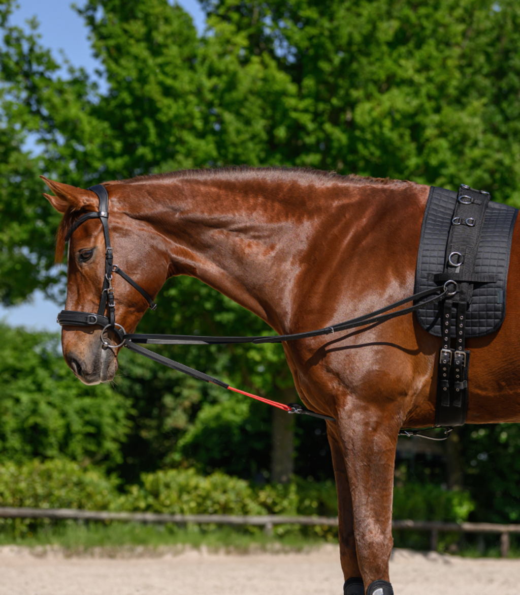 Het buitenmateriaal en de binnenkant zijn gemaakt van een slijtvaste mix van 65% polyester en 35% katoen. De onderlegger kan eenvoudig en betrouwbaar aan de longeersingel worden bevestigd met twee klittenbanden voor een veilige en slipvrije grip. Zo kan je paard zich volledig op zijn werk concentreren.