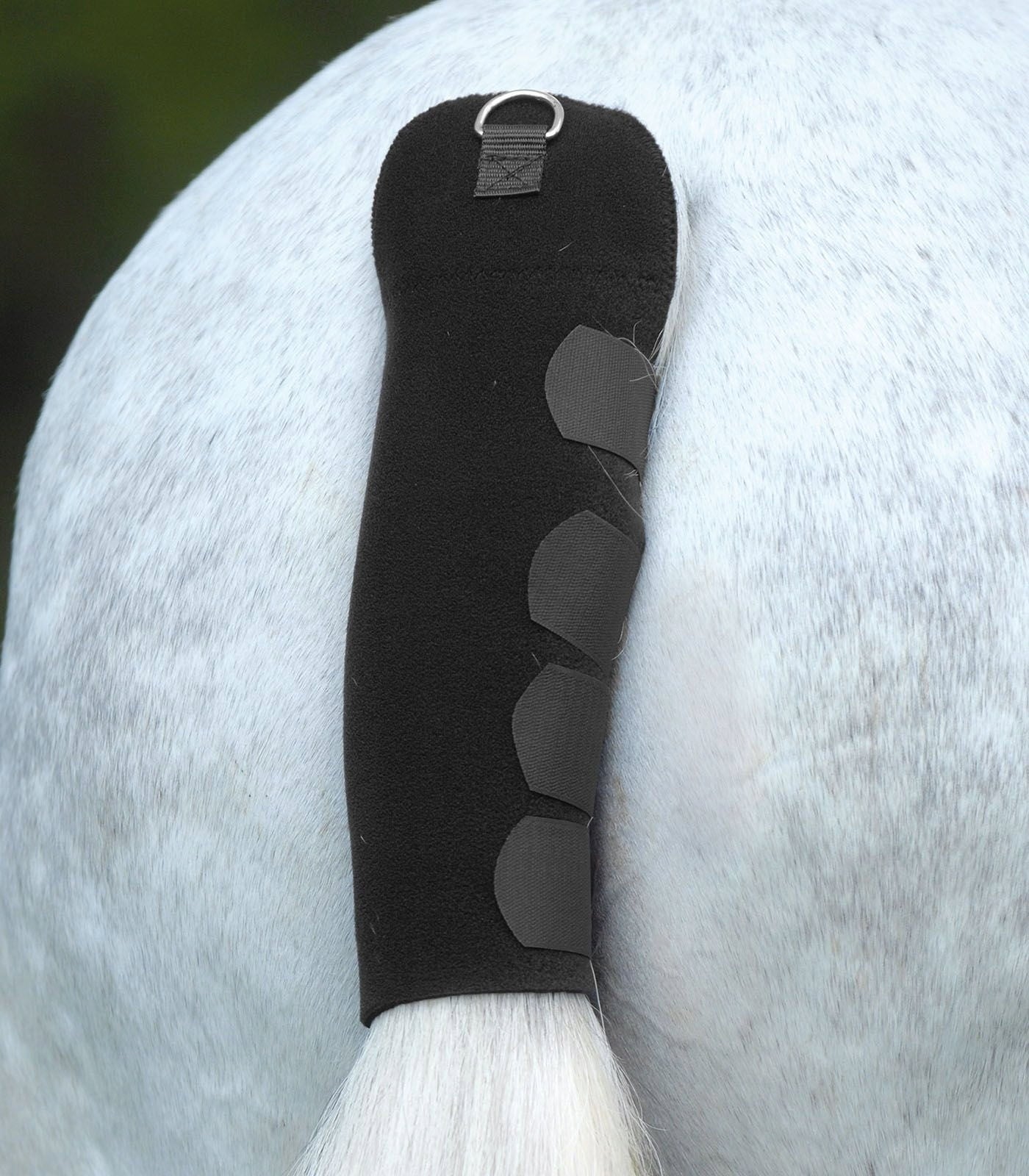 Voor extra veiligheid tijdens het transport is de beschermer aan de bovenkant voorzien van een stevige D-ring, waarmee je hem eenvoudig aan de singel van de deken kunt bevestigen. Zo blijft de staart van je paard schoon, onbeschadigd en perfect verzorgd – zelfs na een lange rit.