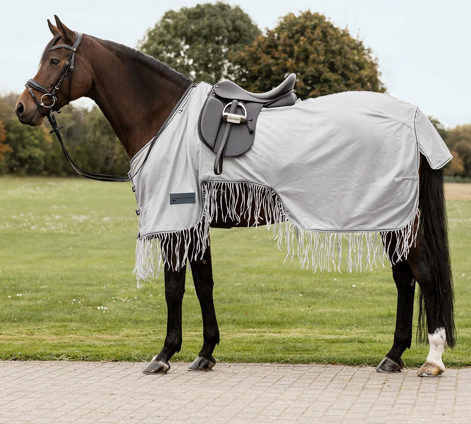 Geniet van ontspannen buitenritten zonder dat je paard constant wordt afgeleid door vervelende insecten. De Waldhausen Protect vliegenuitrijdeken met franjes biedt door het fijnmazige materiaal effectieve bescherming tegen dazen en vliegen tijdens het rijden. Een bijzonder detail zijn de franjes aan de onderrand van de deken: deze bewegen bij iedere stap zacht mee en houden ongewenste gasten actief op afstand nog voordat ze kunnen landen.